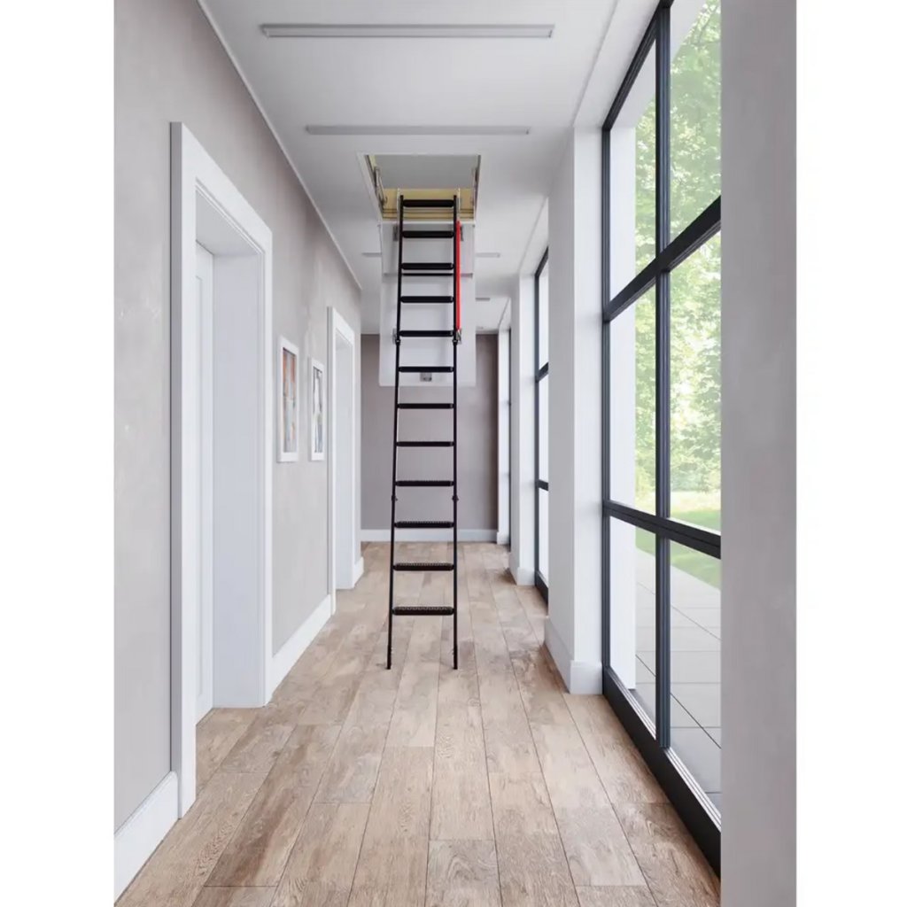 Podkrovné schody FAKRO LME Energy Efficient s kovovým rebríkom ponúkajú výborné tepelnoizolačné vlastnosti, vysokú nosnosť a bezpečný, pohodlný prístup do podkrovia.