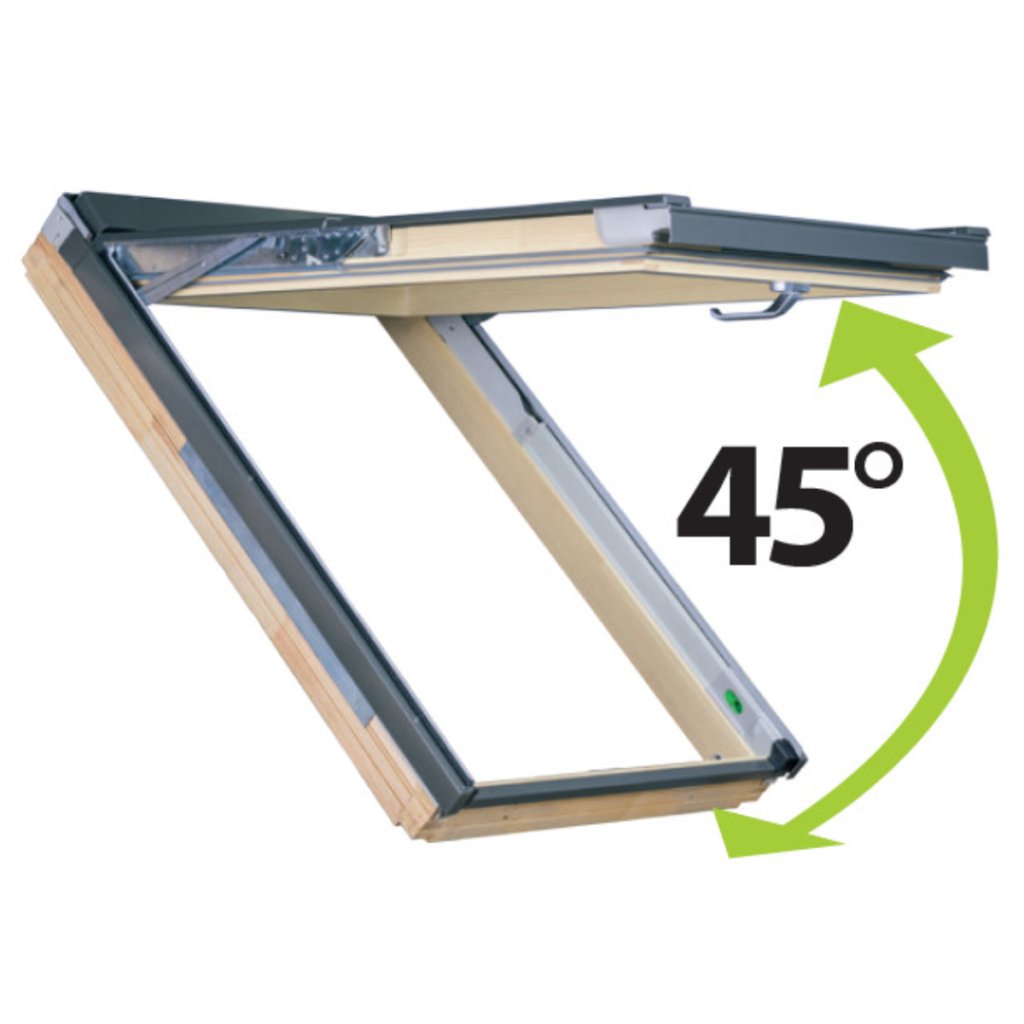Vďaka systému preSelect MAX ponúka okno dva na sebe nezávislé spôsoby otvárania – výklopný a kyvný. Pri výklopnej funkcii sa krídlo otvára až do uhla 45°, čo vytvára viac priestoru v podkroví, zlepšuje výhľad a zvyšuje množstvo denného svetla v interiéri. Inovatívne kovanie zabezpečuje, že je vždy aktívna len jedna zvolená funkcia, čím sa zvyšuje stabilita, bezpečnosť a životnosť okna.