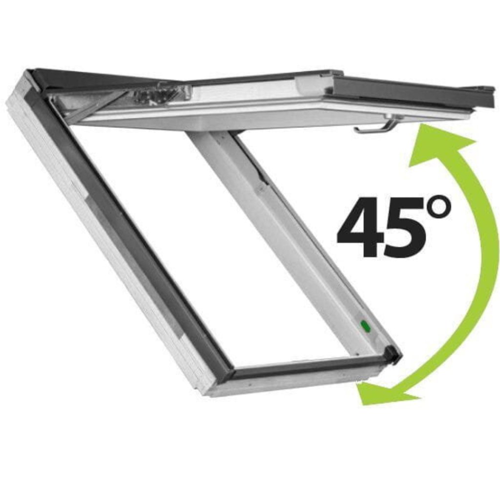 Vďaka systému preSelect MAX ponúka okno dva na sebe nezávislé spôsoby otvárania – výklopný a kyvný. Pri výklopnej funkcii sa krídlo vyklápa až do uhla 45°, čo prináša viac priestoru v podkroví, lepší výhľad a vyšší komfort používania. Inovatívne kovanie zaručuje, že je vždy aktívna iba jedna zvolená funkcia, čím sa zvyšuje bezpečnosť, stabilita a životnosť okna.